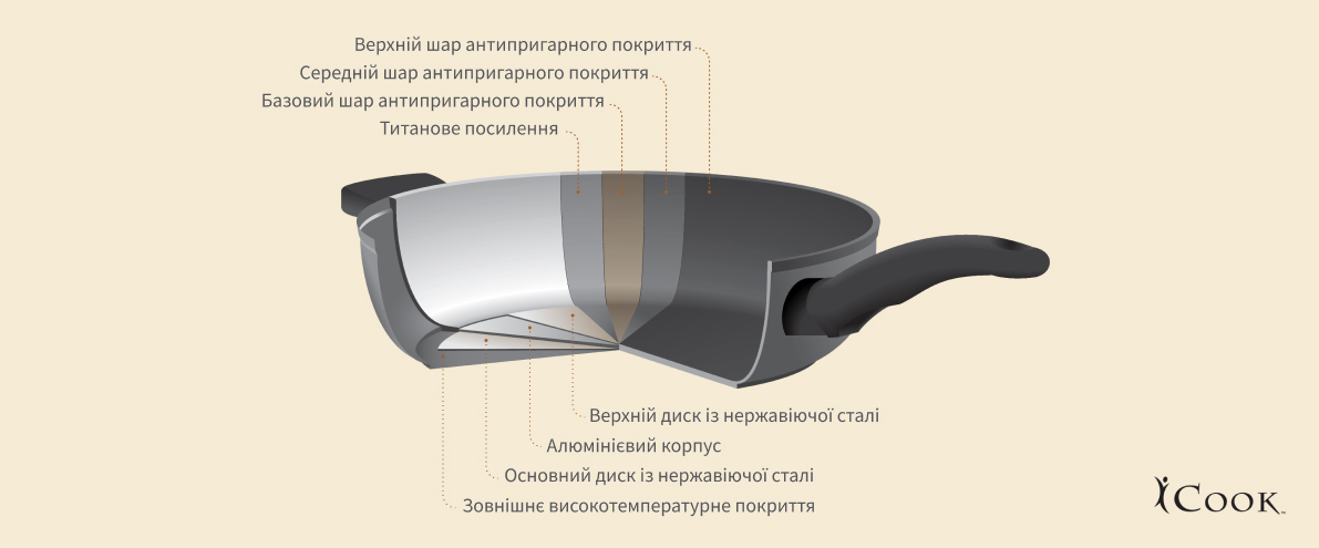 Особливості конструкції корпусу сковорідки iCook™ й антипригарного покриття.